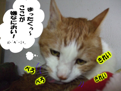 アルコール綿の匂いが気に入らない様子。